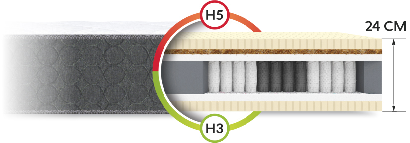 Die BRAVO CASHMERE Matratze verfügt über mehrere zusätzliche Schaumschichten, um noch mehr Schlafkomfort zu bieten. Der beidseitig verwendete Latex erhöht deutlich den Komfort und verhindert übermäßiges Schwitzen während des Schlafs. Ein weiterer Vorteil von Latex ist seine Strapazierfähigkeit und seine hervorragende Anpassung an die Körperformen. Auf einer Seite wurde eine Kokosmatte hinzugefügt, die eine sehr gute Luftdurchlässigkeit gewährleistet und in Kombination mit den Latexschichten allergieneutral wirkt. Elastizität und Stabilität werden durch die Verwendung von hochelastischem HIGH RESILIENCE Schaum gewährleistet.